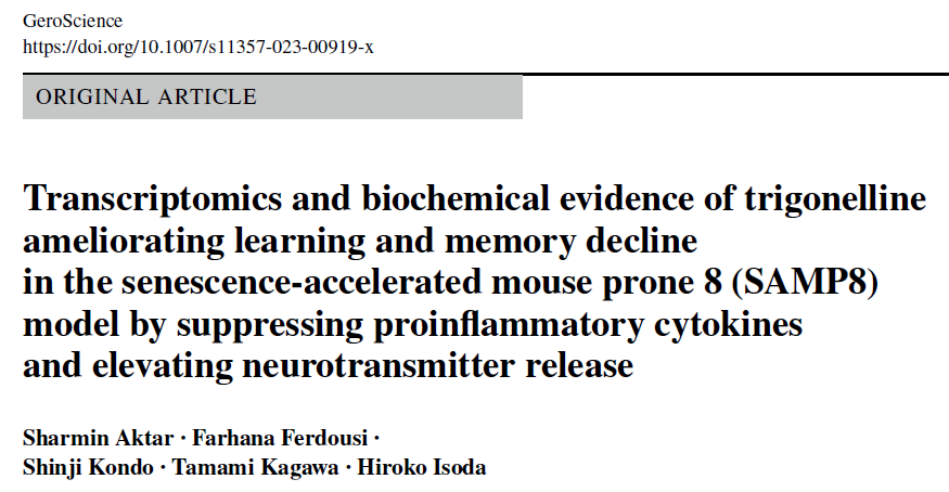 近日,築波大學的研究人員在" GeroScience "期刊上發表了一篇題為" Transcriptomics and biochemical evidence of trigonelline ameliorating learning and memory decline in the senescence-accelerated mouse prone 8 (SAMP8) model by suppressing proinflammatory cytokines and elevating neurotransmitter release "的研究論文。