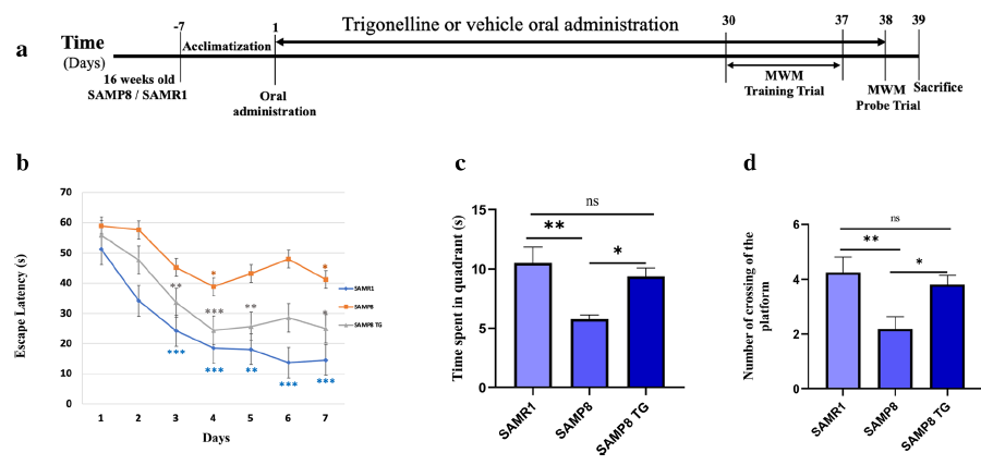 在該研究中,研究人員分析了葫蘆巴堿對加速衰老小鼠模型(SAMP8)學習和記憶衰退的影響,SAMP8小鼠是一種自然的動物模型,表現出加速衰老表型,通過迷宮測試和對小鼠海馬體進行了全基因組轉錄組學分析揭示了葫蘆巴堿對小鼠的影響。
