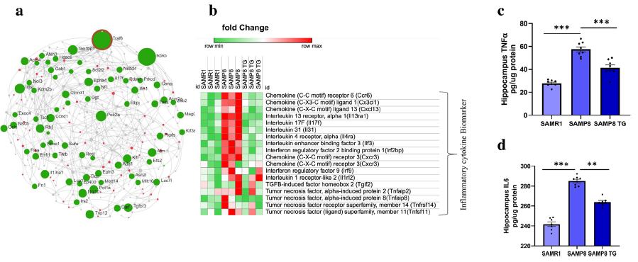 此外,研究人員還分析了葫蘆巴堿生物學作用的潛在靶點,蛋白質-蛋白質相互作用網路分析表明,葫蘆巴堿可能通過負向調節Traf6介導的NF-κB啟動,來發揮其生物學作用,導致TNFα和IL6等促炎細胞因數的合成減少,通過調節Traf6和各種神經遞質之間的相互作用,促進神經遞質的釋放,最終改善了小鼠與衰老相關的認知能力下降。