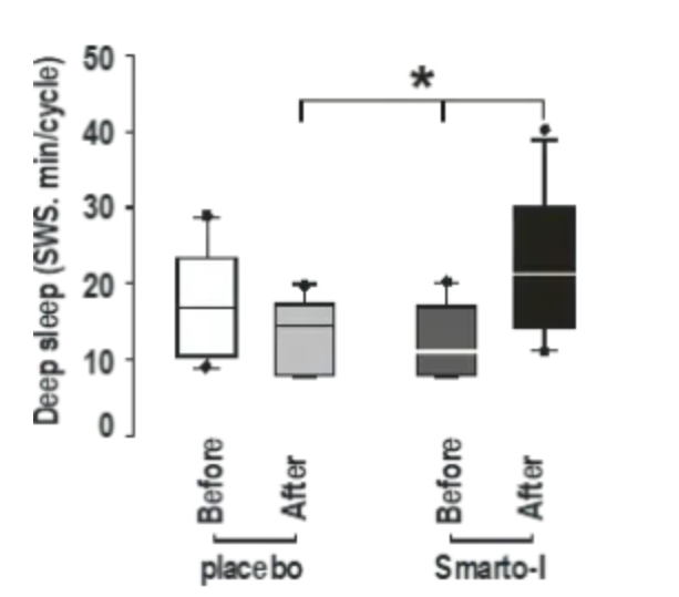 與安慰劑組相比,Smarto-One組的志願者在服用20天後,平均睡眠時間增加了1.94小時,平均每個睡眠週期的慢波睡眠時長增加了11.74分鐘。
