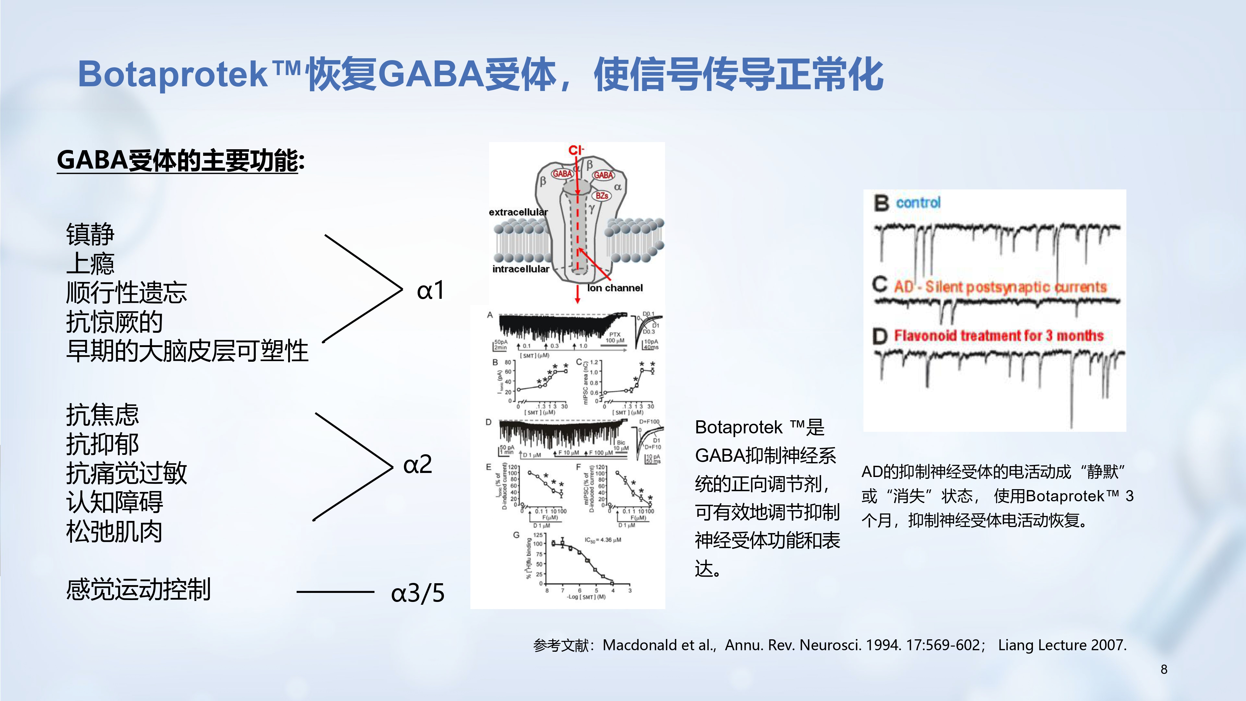 專利創新性小分子黃酮化合物(Flavonoid Mechanism of Action),梁京教授團隊從多種天然植物黃酮中開發的一組小分子的黃酮類化合物,實驗證明它可作為大腦GABA抑制神經受體的正向調節劑。