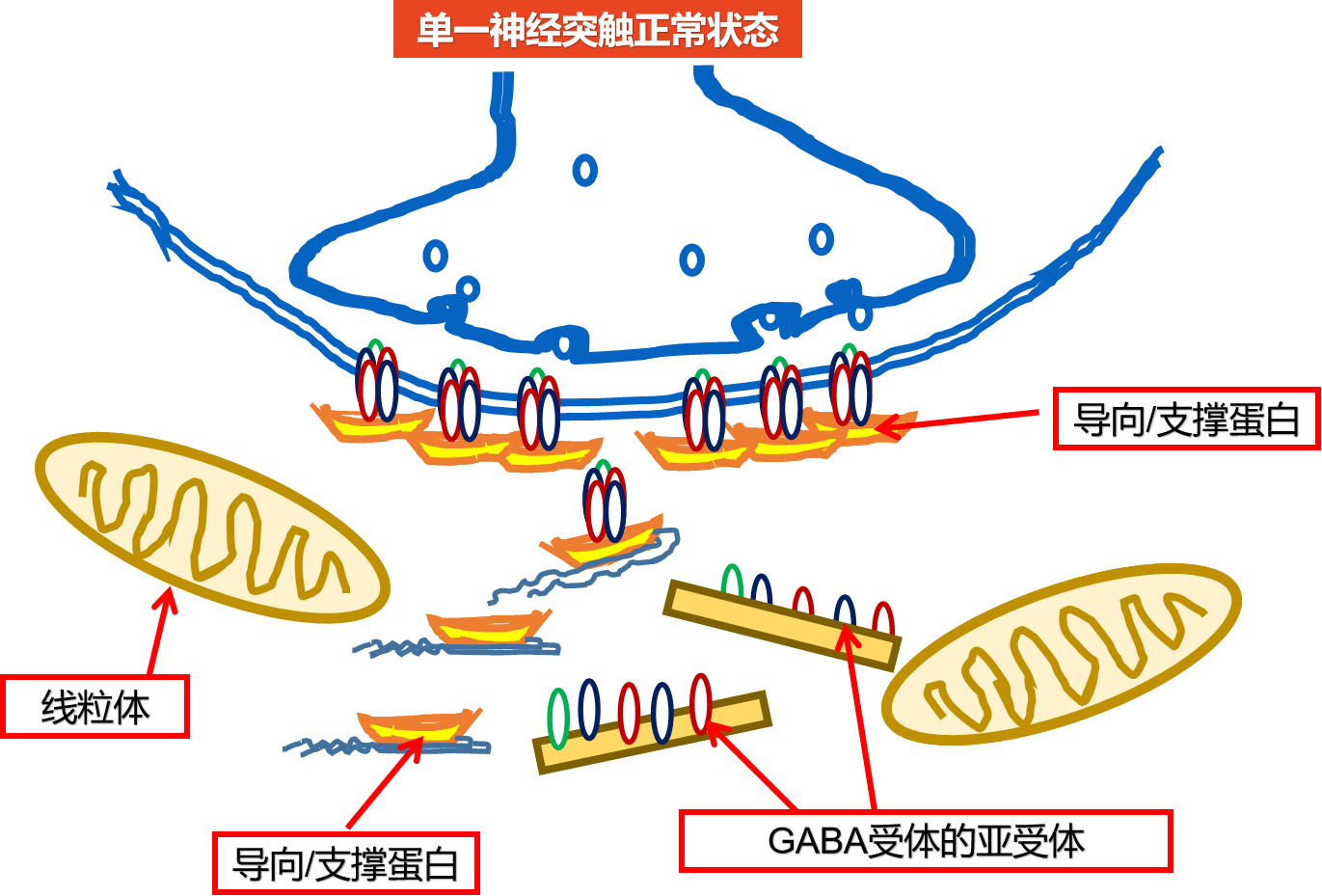 健康大腦中細胞的線粒體可提供充足的能量保證橋蛋白的表達和GABA受體的功能,使信號可正常傳導